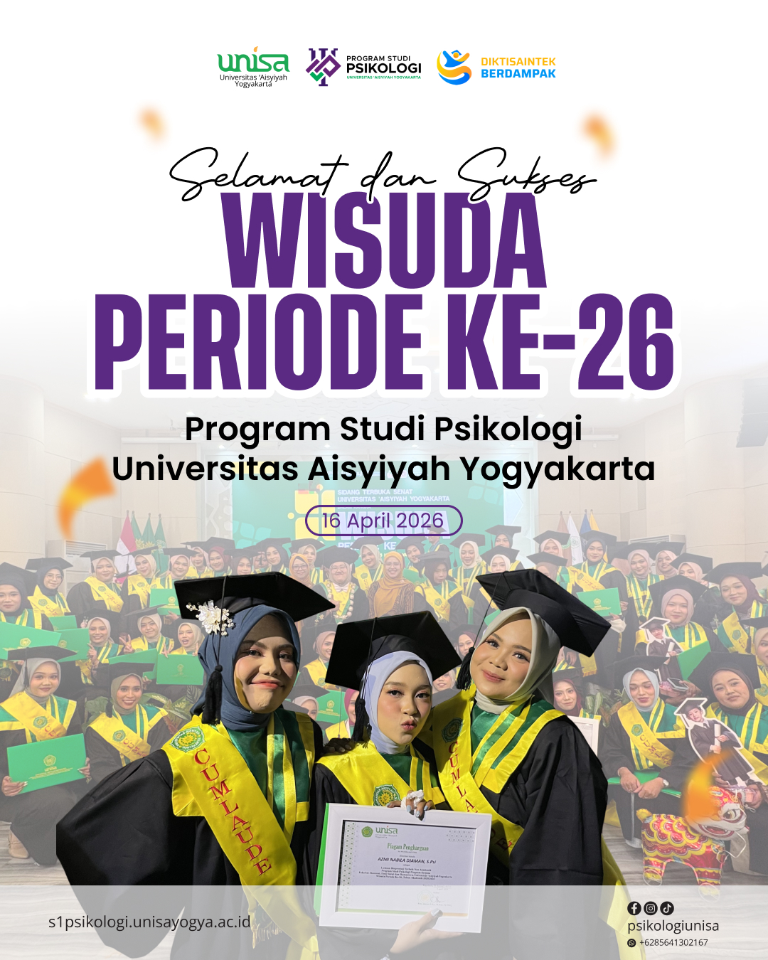 Yogyakarta, 24 April 2026 – Selamat dan sukses kepada seluruh wisudawan Program Studi S1 Psikologi Universitas ‘Aisyiyah Yogyakarta pada Wisuda Angkatan XLV. Perjalanan akademik kalian mungkin telah usai di kampus, namun langkah awal menuju perjalanan yang lebih panjang baru saja dimulai.